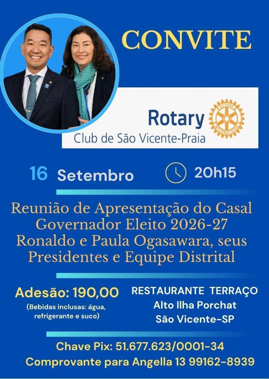 Neste dia 16 de setembro , às 20h15, no Restaurante Terraço, localizado nos altos da Ilha Porchat, em São Vicente, ocorrerá a apresentação do *Governador Ronaldo Ogasawara e sua esposa Paula, seus Presidentes e Equipe Distrital.*