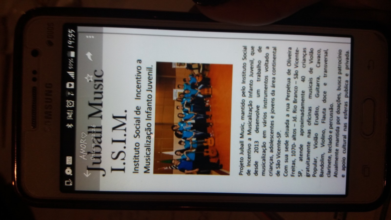 O grupo é regido pelo maestro William Dias, a instituição foi fundada há três anos e atende cerca de 40 alunos, divididos entre crianças e adolescentes. Eles participam de oficinas musicais, aprendem a tocar violão popular e erudito, flauta doce e transversal, clarinete, teclado, contrabaixo, guitarra, cavaco entre outros instrumentos. Para participar é necessária apenas a doação de 1 kg de alimento não perecível e ter entre 9 e 17 anos. As aulas acontecem cinco vezes na semana e têm duração de duas horas. O grupo é mantido por doações, está em busca de apoio cultural e patrocínio nas esferas públicas ou privadas.