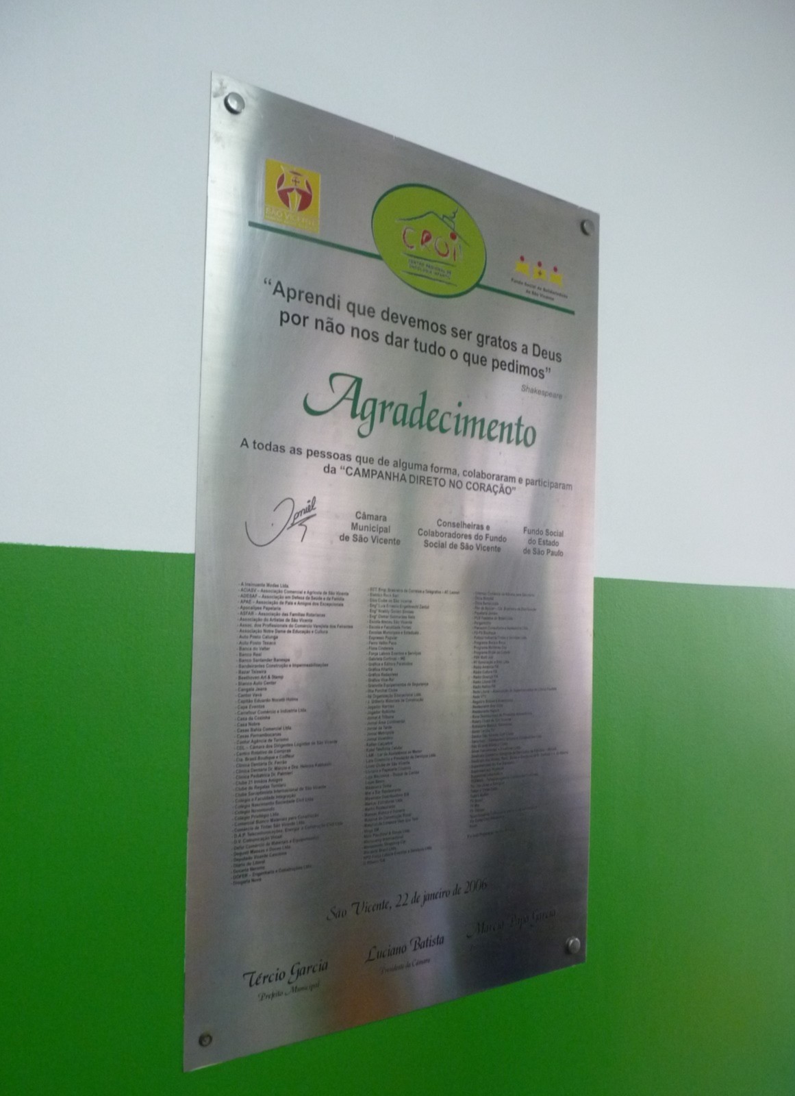 O governador foi conhecer os projetos desenvolvidos pelo clube. O início da visita aconteceu no Centro Médico de Especialidade Infantil (CMEI), onde aconteceu à inauguração do primeiro Consultório Oftalmológico Pediátrico em São Vicente, projeto internacional realizado através de Subsídio Global aprovado pela Fundação Rotária em parceria com a Prefeitura.