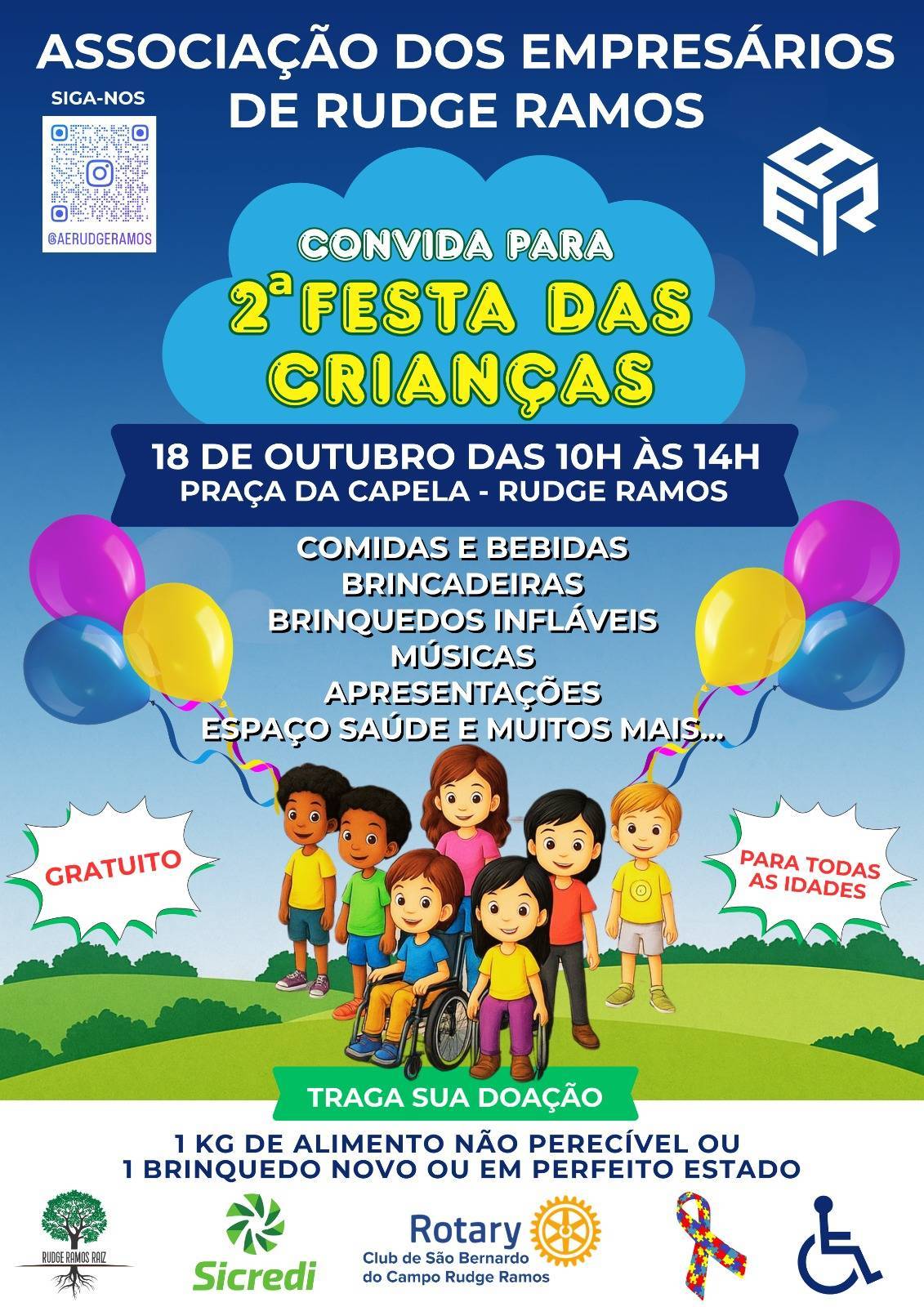 O Rotary Club de São Bernardo do Campo – Rudge Ramos tem a alegria de anunciar seu apoio à 2ª Festa das Crianças, organizada pela Associação dos Empresários de Rudge Ramos (AER). O evento acontecerá no dia 18 de outubro, das 10h às 14h, na Praça da Capela, em Rudge Ramos, e promete uma manhã de muita diversão, integração e solidariedade.